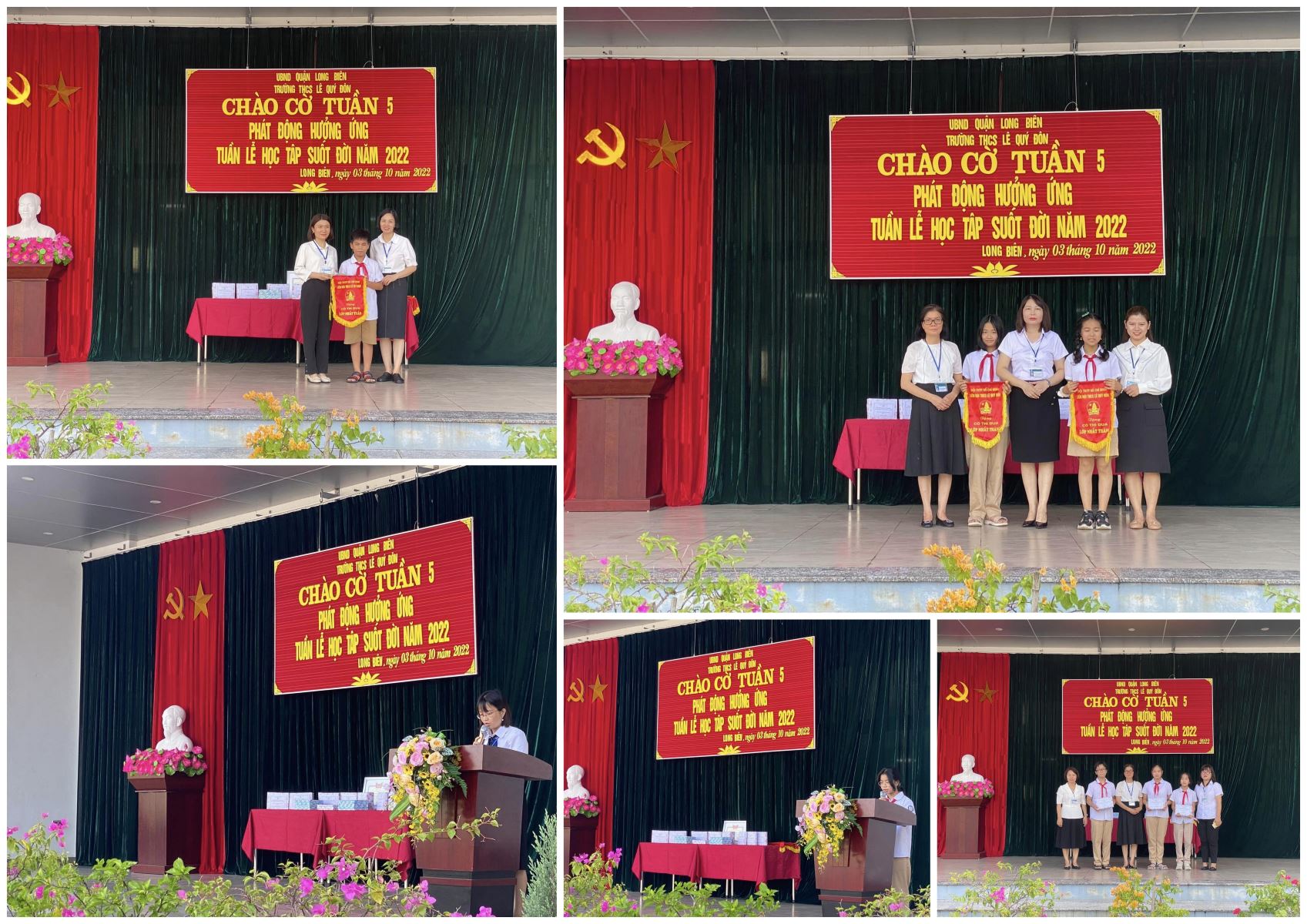 Sáng nay ngày 3/10, trong giờ chào cờ tuần 5, cô giáo Hiệu phó trao cờ thi đua nhất tuần cho cô giáo Hồng Ngọc - chủ nhiệm lớp 6A6 và đại diện lớp. Cô Hiệu trưởng trao cờ thi đua tháng 9 cho cô giáo Tuyết Sơn - chủ nhiệm lớp 7A4, cô giáo Thuỳ Linh - chủ nhiệm lớp 7A2 và 2 bạn lớp trưởng 7A4, 7A2.