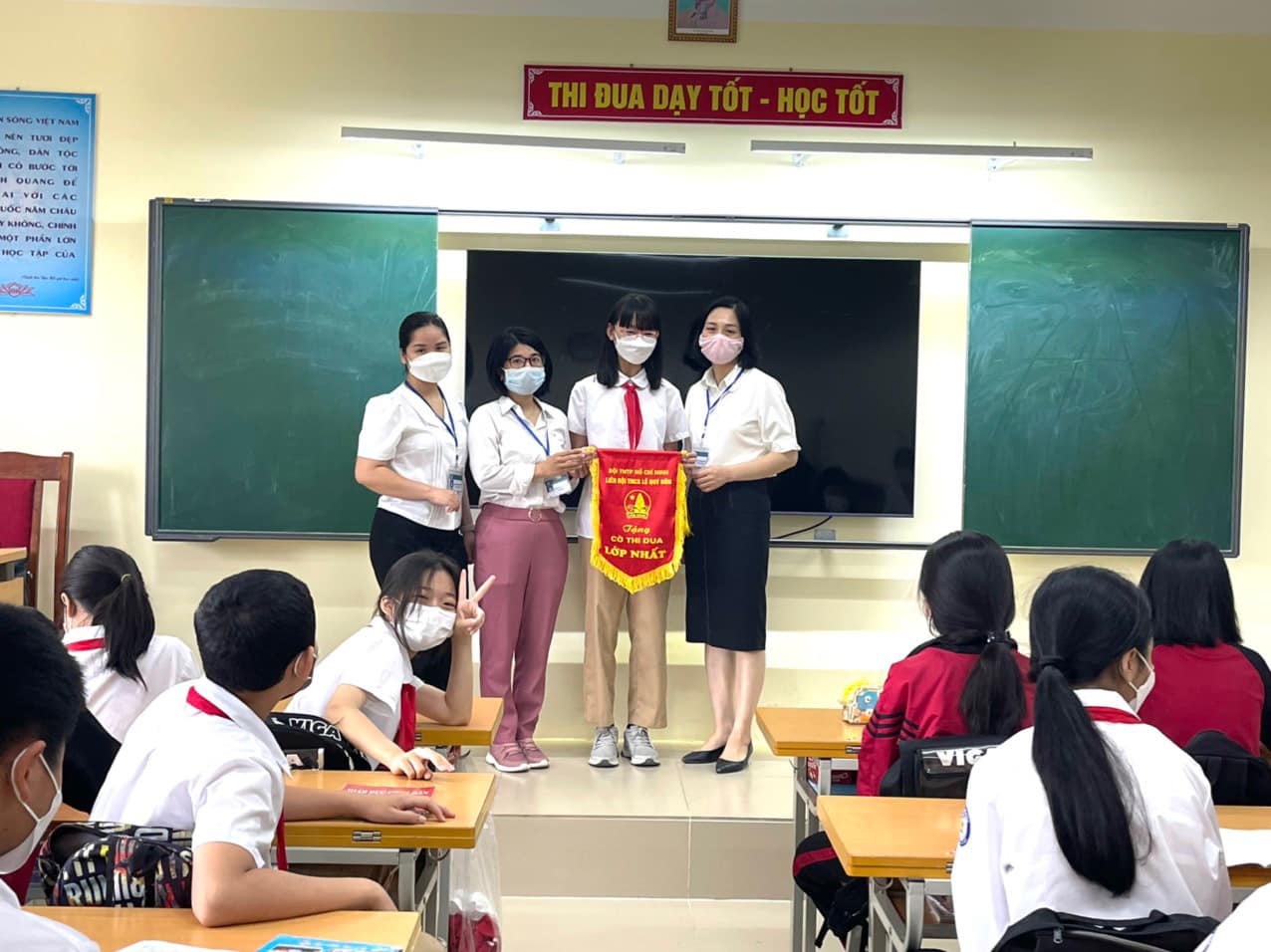 Sáng thứ 2 (23/5/2022), do điều kiện thời tiết nên các lớp đã có tiết chào cờ tại lớp. Đại diện BGH - cô giáo Khúc Thị Thanh Hiền (Phó hiệu trưởng nhà trường) và cô giáo tổng phụ trách Phan Thuỳ Dương đã lên các lớp 7A1, 8A1 trao cờ thi đua dẫn đầu tuần qua.