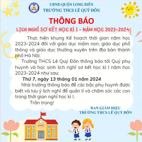Trường THCS Lê Quý Đôn trân trọng thông báo tới các bậc phụ huynh và các con học sinh lịch nghỉ sơ kết Học kì I - Năm học 2023-2024. Kính mong các bậc phụ huynh lưu tâm, chăm sóc và tự quản lý con tại nhà. Trân trọng!