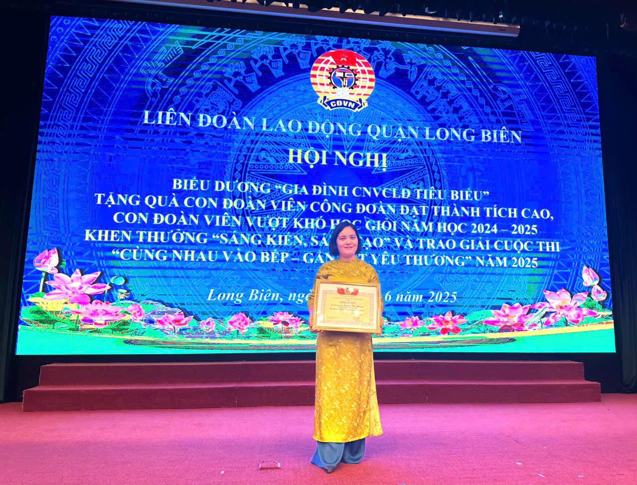 Trường THCS Lê Quý Đôn vinh dự và tự hào khi có cô giáo Nguyễn Thu Phương – giáo viên Ngữ văn – được Liên đoàn Lao động Quận Long Biên trao thưởng “Gia đình công nhân viên chức lao động tiêu biểu” năm 2025.