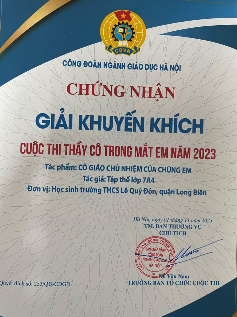 Trong thành công và sự trưởng thành của mỗi con người đều xuất hiện sự dạy dỗ của thầy cô giáo. Để tri ân tấm lòng cao cả đó, tập thể lớp 7A4 đã gửi gắm những tình cảm chân thành nhất qua tác phẩm: "Cô giáo chủ nhiệm của chúng em". Tác phẩm đã xuất sắc đạt giải Khuyến khích của cuộc thi "THẦY CÔ TRONG MẮT EM NĂM 2023". Chắc chắn đây là món quà ý nghĩa và đặc biệt nhất trong lòng cô giáo.
