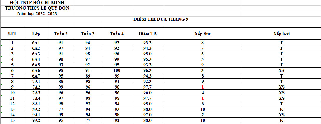 * Điểm thi đua và xếp loại tháng 9 năm học 2021-2022