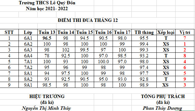 * Điểm thi đua và xếp loại Tháng 12 năm học 2021-2022
