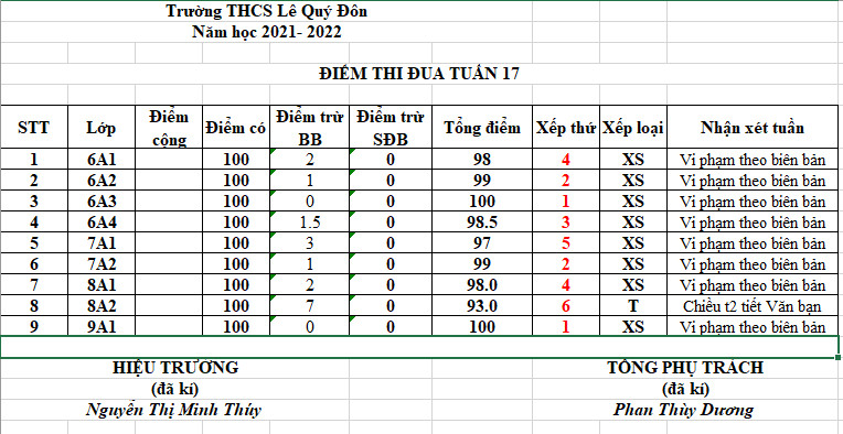 * Điểm thi đua và xếp loại tuần 17 năm học 2021-2022