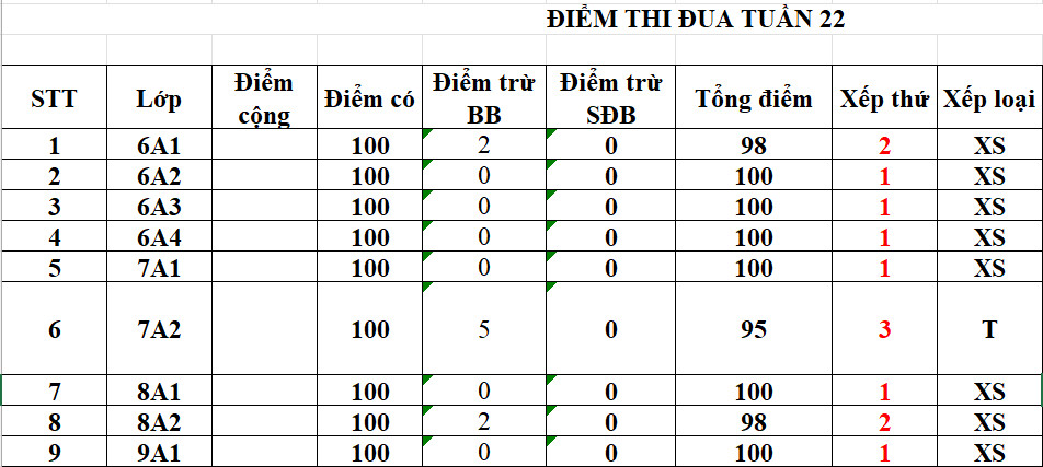 * Điểm thi đua và xếp loại tuần 22 năm học 2021-2022
