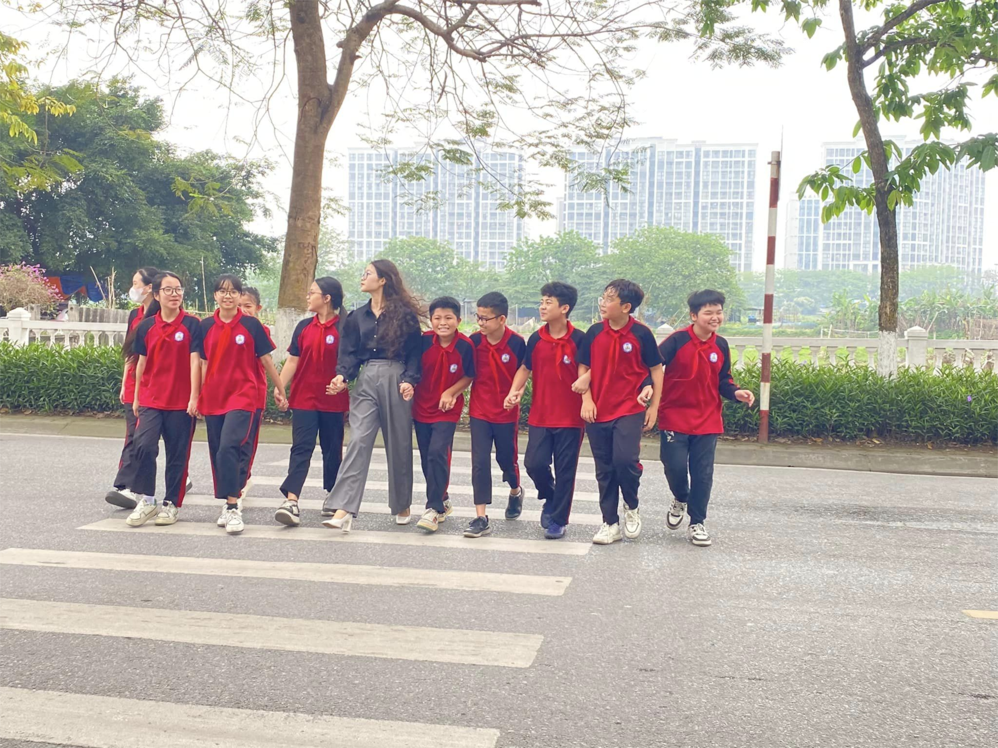 Xuất phát từ tình hình thực tế, trường THCS Lê Quý Đôn có nhiều học sinh tự đến trường bằng phương tiện giao thông công cộng nên ngoài việc tuyên truyền thường xuyên thì hôm nay (17/4) các thầy, cô giáo trong Ban thiếu nhi đã có buổi hướng dẫn học sinh sang đường an toàn để đến các điểm xe buýt.