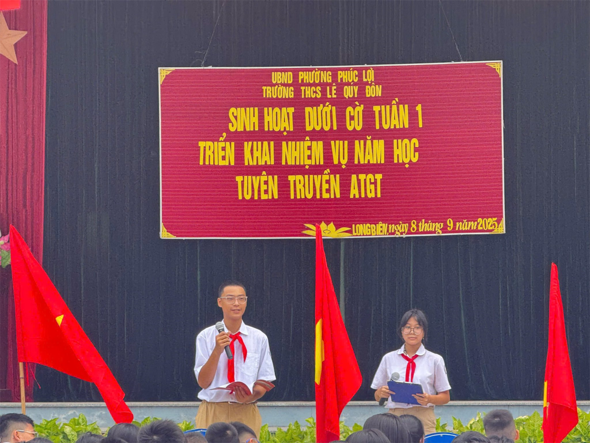 Sau nghi lễ chào cờ trang nghiêm, tập thể cán bộ, giáo viên và học sinh đã cùng nhau lắng nghe triển khai nhiệm vụ năm học mới.