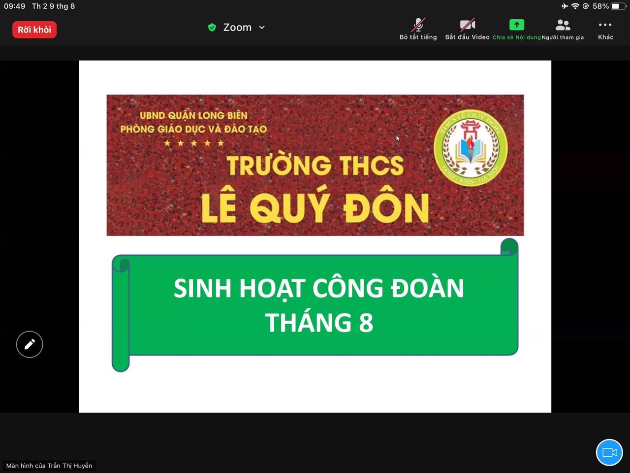 Tiếp đến đ/c triển khai các hoạt động tháng 8 với trọng tâm là việc Hoàn thiện hồ sơ bầu Ban chấp hành công đoàn năm học 2021- 2022 nộp Liên đoàn lao động quận ngay sau đi CBGVNV nhà trường đi làm trở lại, lập danh sách các đồng chí giáo viên hợp đồng có nguyện vọng gia nhập tổ chức Công đoàn. Đặc biệt, trong buổi sinh hoạt công đoàn tháng 8, BCH CĐ đã tổ chức buổi sinh nhật “Hương vị tình thân” cho các đồng chí cán bộ giáo viên, nhân viên có sinh nhật tháng 7,8,9: Tạ Thị Tuyết Sơn, Khúc Thị Thanh Hiền, Vũ Thu Thuỷ, Nguyễn Thị Hà, Nguyễn Thị Hồng Nhung, Nguyễn Thị Thanh Hương, Phan Thuỳ Dương, Nguyễn Hồng Nhung. Quả thực, giữa lúc tình hình bệnh diễn biến phức tạp, toàn thành phố thực hiện giãn cách xã hội đợt 2 theo công điện số 18, cả nước đang căng mình với khẩu hiệu “ chống dịch như chống giặc” mà chúng tôi vẫn được cùng với các đồng nghiệp của mình hát vang bài hát chúc mừng sinh nhật, được thổi nến online, được trao và nhận những lời chúc mừng tốt đẹp… thật vô cùng hạnh phúc !