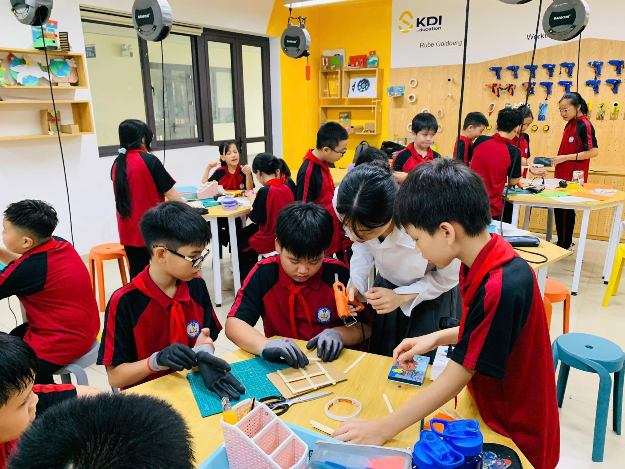Không khí lớp học ngập tràn tiếng cười, tiếng bàn bạc sôi nổi. Những đôi bàn tay khéo léo cắt dán, trang trí, phối hợp màu sắc đã biến các vật liệu đơn giản như giấy màu, que tre, bìa cứng… thành những sản phẩm rực rỡ và đầy ý nghĩa. Các em vừa học cách ứng dụng kiến thức khoa học – kĩ thuật, vừa rèn luyện tư duy thẩm mỹ, khả năng giải quyết vấn đề và sự khéo léo.